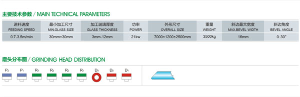 1.本機適用于磨削平板玻璃直線斜邊與底邊,斜邊的粗磨、精磨、拋光及底邊的磨削一次加工完成;