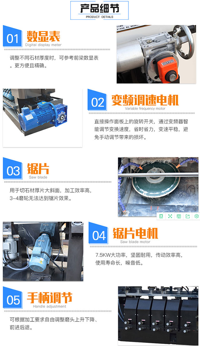 產(chǎn)品介紹:該機(jī)適合用于不同尺寸的厚度的平板石材和45°角磨削,帶鋸片被切功能。45度斜角、直邊平面加工,可粗、精磨拋光一次性完成,拋光后接近于石材母體的光潔程度。采用變頻調(diào)速進(jìn)料,可方便快捷調(diào)節(jié)加工速度。調(diào)節(jié)不同加工厚度時(shí),可參考前梁上的數(shù)顯表進(jìn)行調(diào)整,本機(jī)具有結(jié)構(gòu)先進(jìn),精確度高,操作方便,同一厚度可連續(xù)加工等優(yōu)點(diǎn),是石材深加工必備設(shè)備。